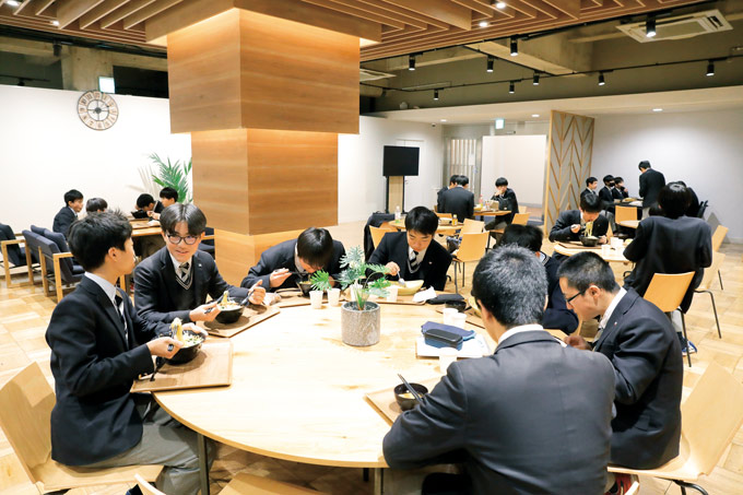 教室や食堂、各々の好きな場所でお昼を食べます。食堂では定食の他に、テイクアウトのお弁当も販売しています。