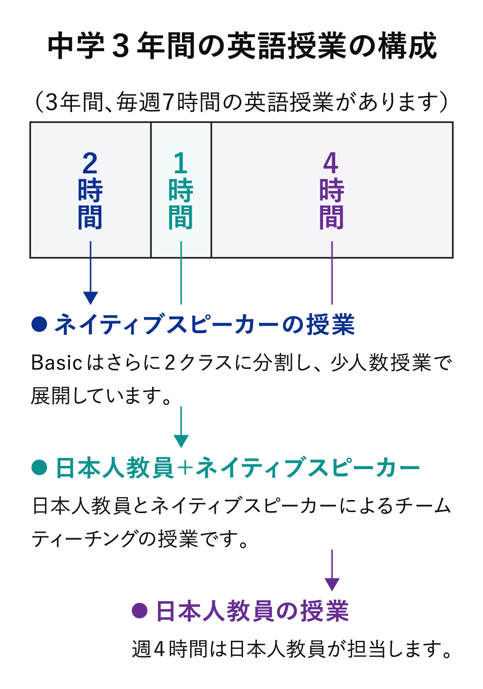中学3年間を通して英語の授業は週7時間で構成され、全ての授業を習熟度に応じてAdvancedとBasicにクラスを分けています。帰国生や英検上級取得者はAdvancedクラスで、より高度な英語力を身に付けていきます。Basicクラスでは英語の基礎から徹底して学びます。7時間のうちネイティブスピーカーの授業2時間はBasicクラスをさらに細分化し、少人数で個々のレベルに合わせた学習が進められます。