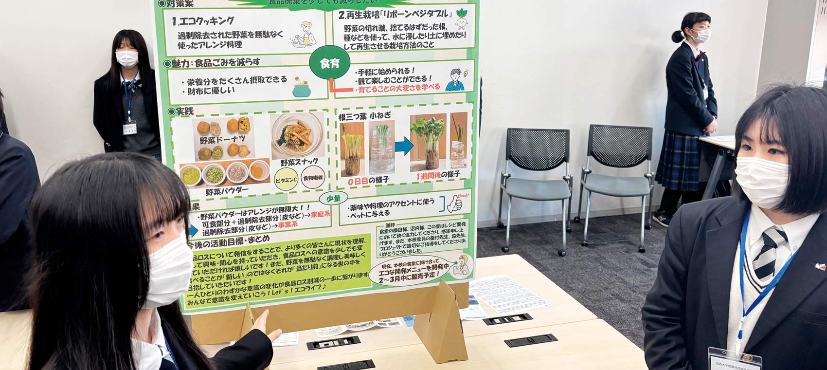 食品ロス削減をテーマに探究活動を進め、城西の食堂内で食べられるにもかかわらず廃棄されてしまう野菜の切れ端を使ったマフィンを考案・開発を行いました。その後も立教大学と共同で様々な食品ロスを防ぐための実現可能なアイディアを考案、発信する啓蒙活動を行い、大阪万博にてフードロス防止のプレゼンテーションをするに至りました。