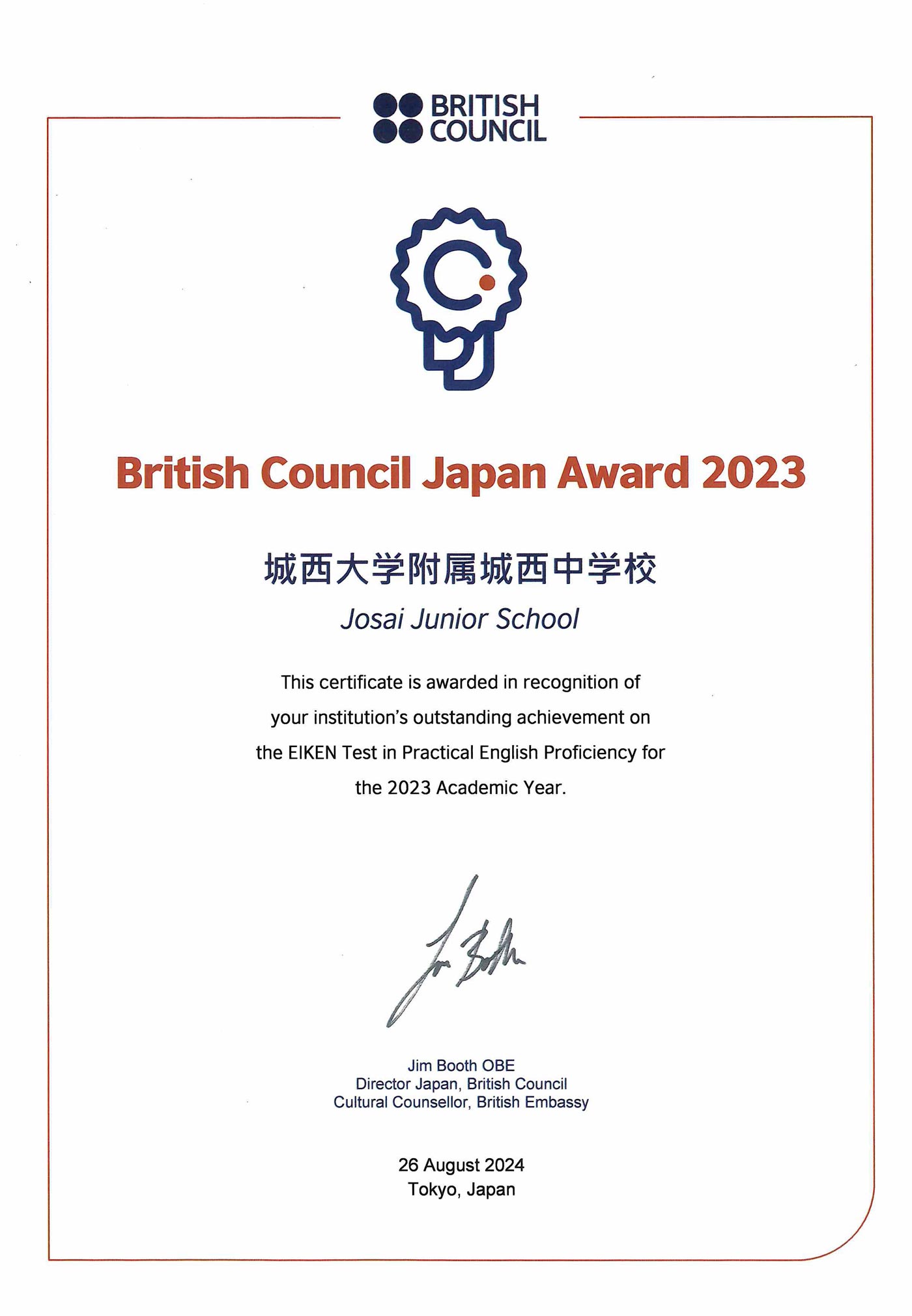 2023年度英検取得率全国私学1位 ブリティッシュ・カウンシル駐日代表賞を受賞しました