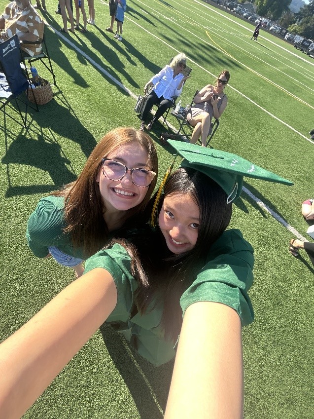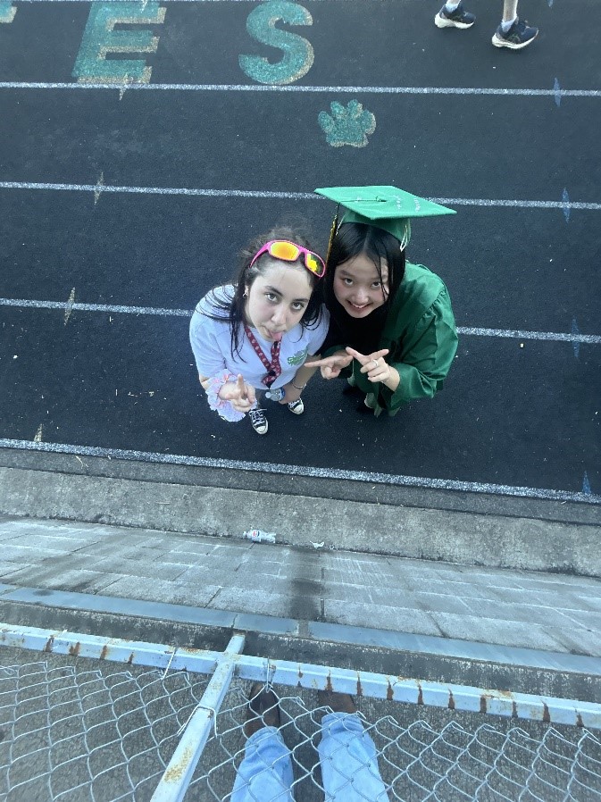 私は卒業生としてアメリカの卒業式に参加しました。アメリカの高校では、ガウンと四角い帽子を着用します。スイートホーム高校のスクールカラーが緑色だったので、緑色のガウンと帽子を着用しました。今までにアメリカの卒業式などの画像でそのような服装を見てきたので、私自身がそれを着ているのはなんだか不思議な感覚でした。卒業式では、日本の卒業式と同じように一人ずつ名前を呼ばれて証書を手渡しでもらいます。いざそれを受け取ると、ついにこの町とこの学校と生活から離れてしまうのかと改めて実感して寂しい気持ちになりました。しかし、それと同時にこの留学生活をやり遂げたということを自覚しました。高校の卒業式の後、卒業生のみで行われるパーティーがありました。なんと、そのパーティーは夜の十時から次の日の朝の四時まで通して行われました。そのパーティーは学校で行われるのですが、学校に様々な遊園地にあるようなアトラクションが設置されていました。日本では考えられないような出来事に困惑しつつも全力で楽しむことができました。