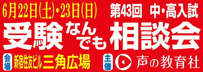 6/22,23(土,日)に新宿住友ビルにて開催されます声の教育社主催、第43回受験なんでも相談会に本校も出展します。22日(土)は中学、23日(日)は高校のご案内が中心となる予定です。