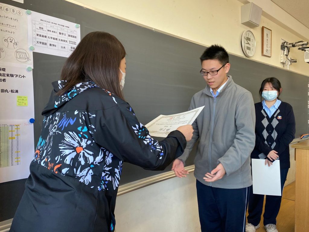 姉妹校の上海市甘泉外国語中学の留学生2名(王さんと章君)が、2/15(木)~2/24(土)の短期留学課程を無事終えました。