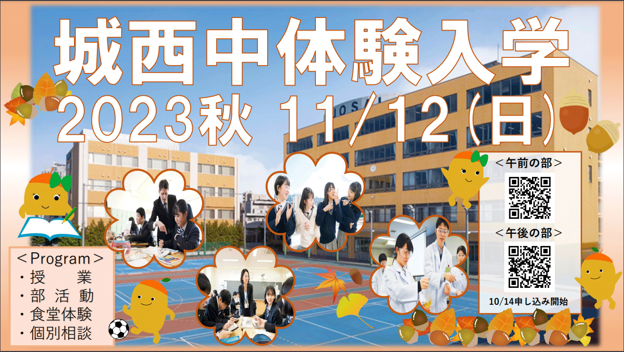 11月12日(日)に開催されます城西中学校体験入学のご予約についてですが、システムの不具合により「午後の部」の申し込み開始日が本日10月1日になっており、ご迷惑をおかけして大変申し訳ございません。体験入学の申し込みについては、10月14日(土)12時から、午前の部・午後の部共に申し込み開始になりますので、どうぞよろしくお願いいたします。
