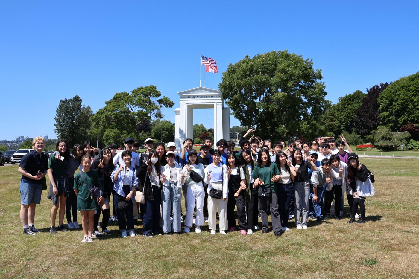 本日は英語研修後、カナダとアメリカにまたがるピースアーチ国際公園で陸の国境を体験しました。