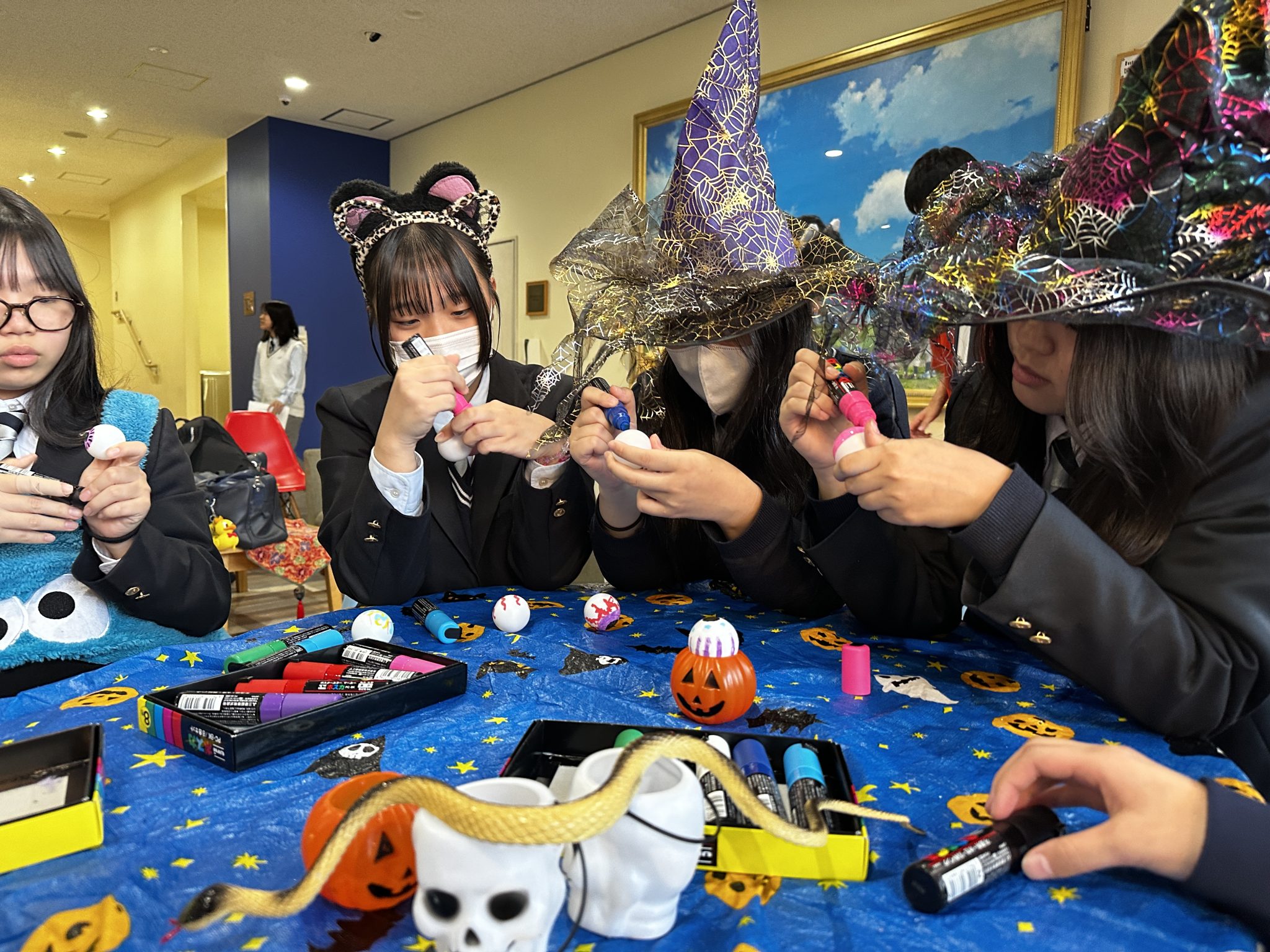 留学生と一緒に仮装をして、ゲームで盛り上がりました。ピンポン球を目玉のイメージに塗り、その「目玉」を使ってリレーゲームをしました。チームに分かれて、一人目が目玉をスプーンで中継ポイントまで落とさずに運び、2人目が目玉をカップに投げ入れ、成功したチームにはお菓子のプレゼントがありました。カップにボールがたまると徐々に難しくなり、生徒たちは苦戦していました。