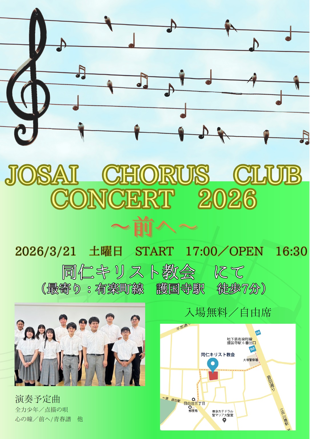 合唱部・定期演奏会のお知らせです。3/21(土)16:30開場 17:00開演 終演予定18:50同仁キリスト教会(有楽町線 護国寺駅より徒歩10分)入場無料・自由席演奏予定曲・全力少年・点描の唄・心の瞳・前へ 他プログラムの最後には本年度卒業した高校3年生の部員を対象に、「卒団式」を行います。お時間ございましたら、ぜひお越しください。